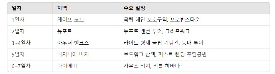 - 비행기 + 렌터카 조합: 보스턴(케이프 코드), 뉴포트, 노폭(버지니아 비치), 마이애미 등 주요 공항을 이용한 후 렌터카를 빌리는 방법이 좋습니다.